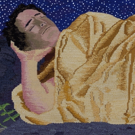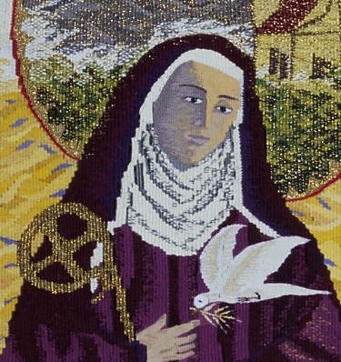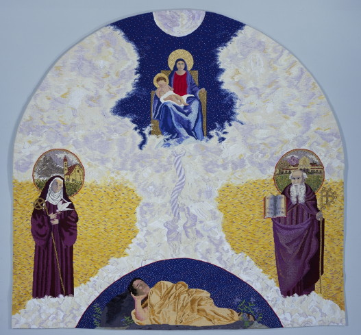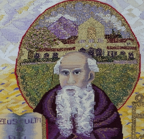 'Jacob's Ladder' was commissioned by the Abbey and through the generous patronage of oblate Henry Ellis, and friends Jim Brown and Hal Painter. This tapestry was five years in research, designing and weaving by Pam with close communication with the monastery community and Father Nathan Zodrow.